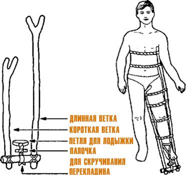 Очень сильные мышцы держат сломанную кость (бедро) на месте, что затрудняет поддержание тяги в период заживления. Вы можете сделать импровизированную шину для вытяжки с использованием натуральных материалов (см. рис.) следующим образом: